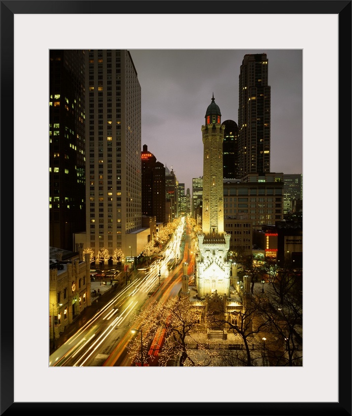 <p>Huge photograph looks down a busy avenue flooded with people and cars, while a variety of tall buildings encapsulate the street. Photographer uses a slow shutter speed to get the fast moving effect of lights on the cars.</p>