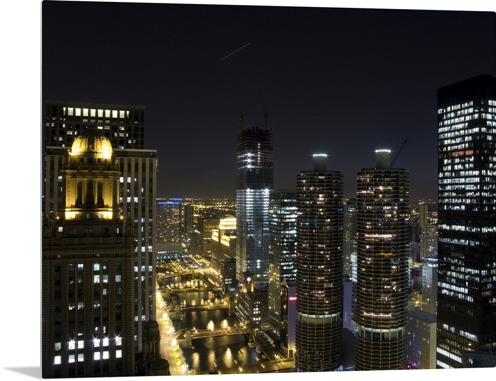 <p>Tall buildings in Chicago are illuminated under a night sky that has a single shooting star photographed.</p>