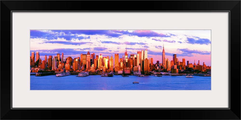 <p>Panoramic photograph of the water in front of the New York City skyline, beneath a vibrant, partly cloudy sky at sunset.</p>