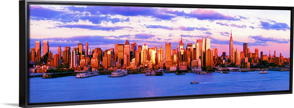 <p>Panoramic photograph of the water in front of the New York City skyline, beneath a vibrant, partly cloudy sky at sunset.</p>