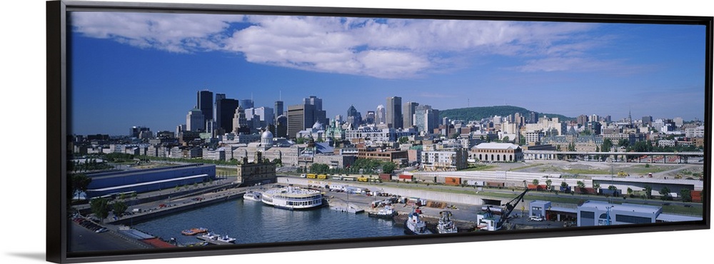 <p>Panoramic photograph of many buildings along the shoreline of Old Port in Montreal, Quebec, Canada. Many boats sit in the water near the shore, in the foreground, beneath a light blue sky.</p>
