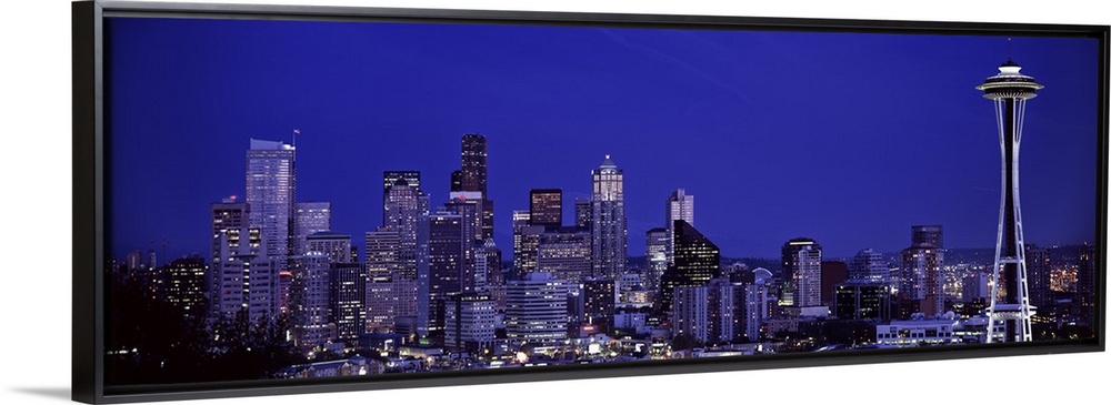 <p>Panoramic photograph of skyline at night with buildings lit up. Iconic buildings such as the Space Needle and others glow under clear skies.</p>