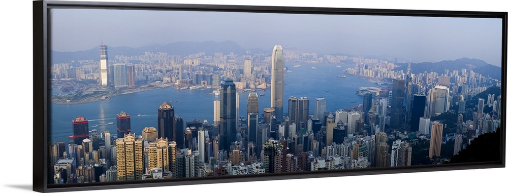 <p>Wide angel, aerial photograph of large buildings in Hong Kong, China, surrounding Victoria Harbour.</p>