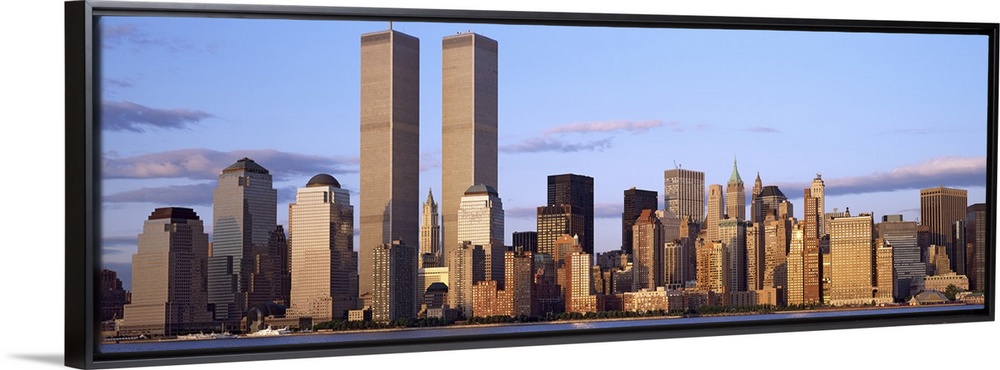 <p>The Manhattan skyline is photographed in panoramic view with the World Trade Center buildings standing out as they tower over the other skyscrapers.</p>