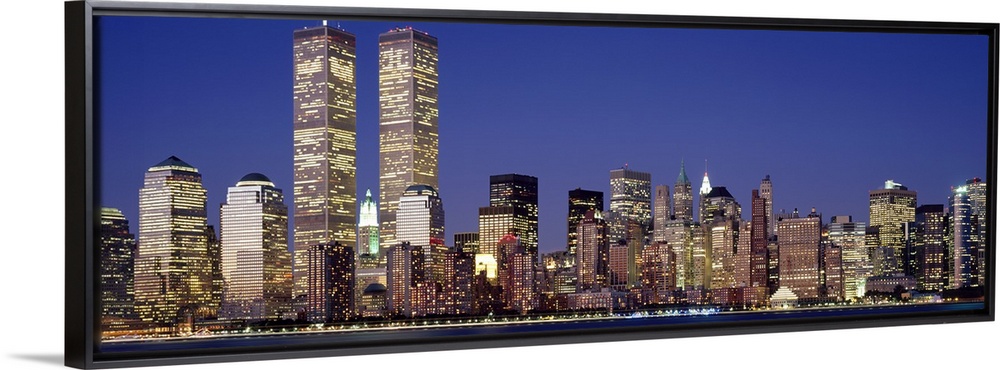 <p>Panoramic photograph displays the nighttime skyline of a busy city within the Northeastern United States sitting next to the Hudson River. The nicknamed "Twin Towers" can be seen overshadowing the other brightly lit buildings that fill the city.</p>
