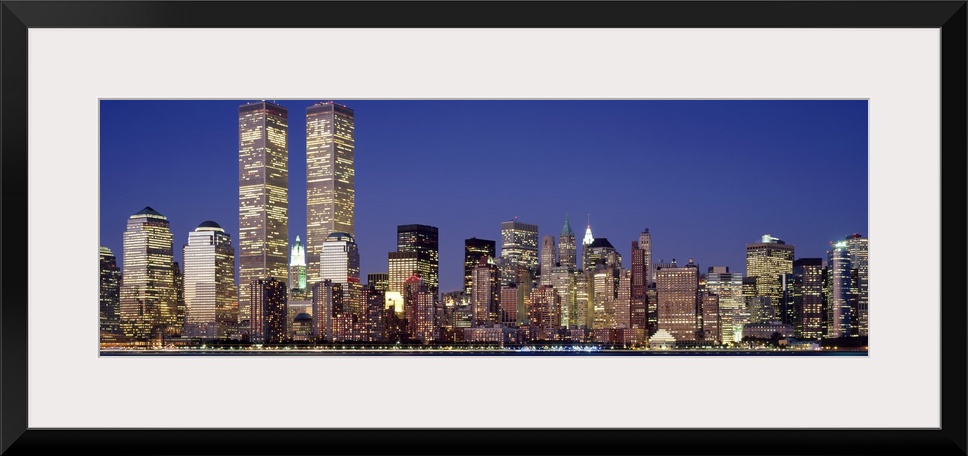 <p>Panoramic photograph displays the nighttime skyline of a busy city within the Northeastern United States sitting next to the Hudson River. The nicknamed "Twin Towers" can be seen overshadowing the other brightly lit buildings that fill the city.</p>