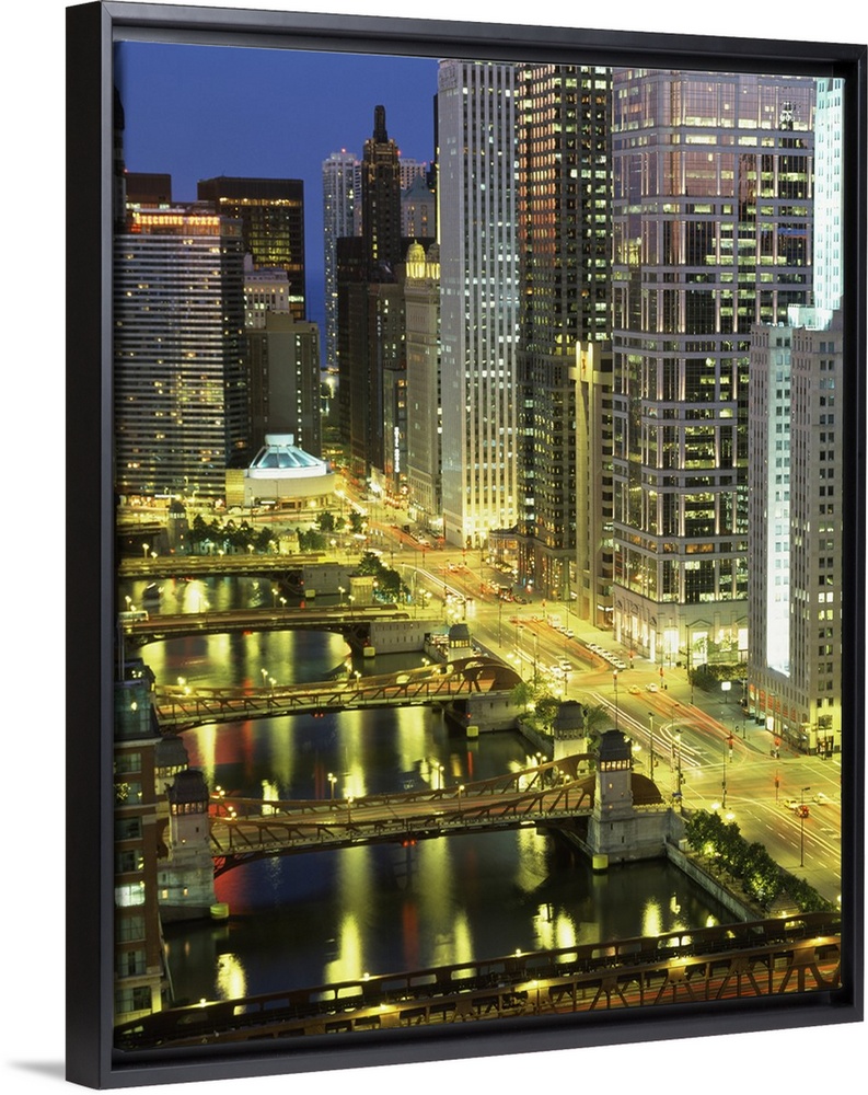 <p>Big photograph shows an aerial view overlooking groups of skyscrapers found within a busy Midwestern city as they glow at nighttime. Included in this picture are a number of bridges crossing over a calm waterway that is reflecting all of the bright lights of the surrounding elements.</p>