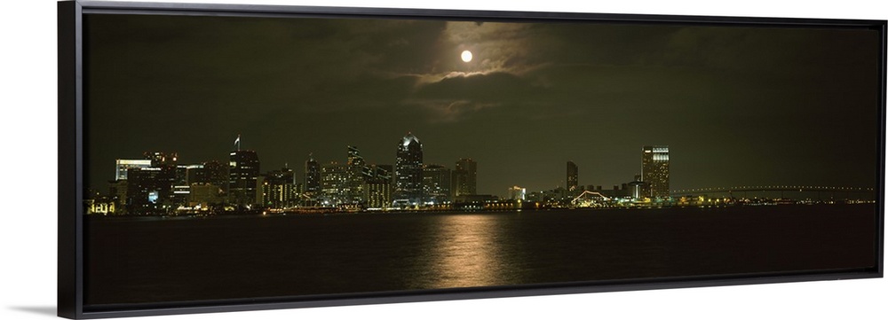 <p>Panoramic photograph taken at nighttime shows a distant view of the brightly lit skyline within a busy city off the coast of the Western United States. In the sky, a full moon can be seen glowing over the cityscape and highlighting a portion of the bay in the foreground.</p>