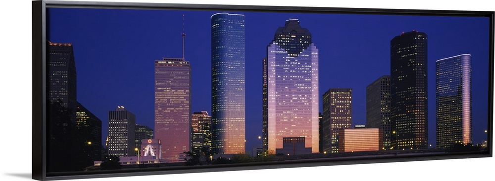 <p>Large panoramic view of the Houston skyline with the buildings illuminated during the night.</p>