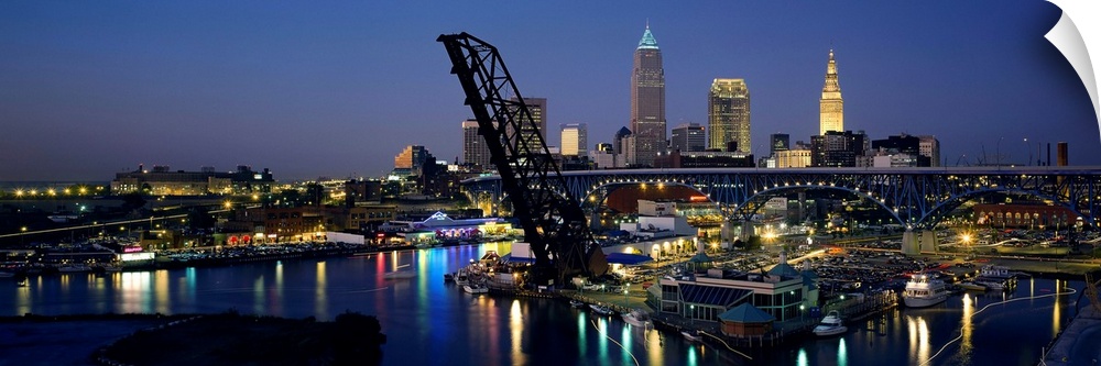 <p>This is a panoramic photograph showing the downtown of the city and a river harbor with a raised railroad bridge.</p>