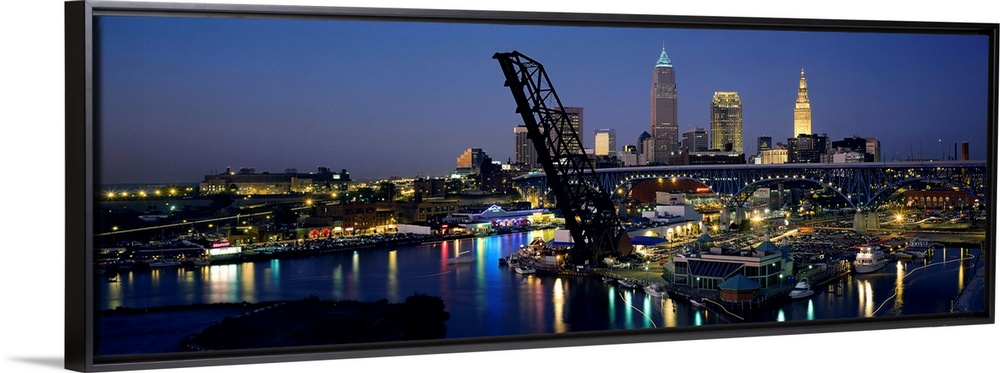 <p>This is a panoramic photograph showing the downtown of the city and a river harbor with a raised railroad bridge.</p>