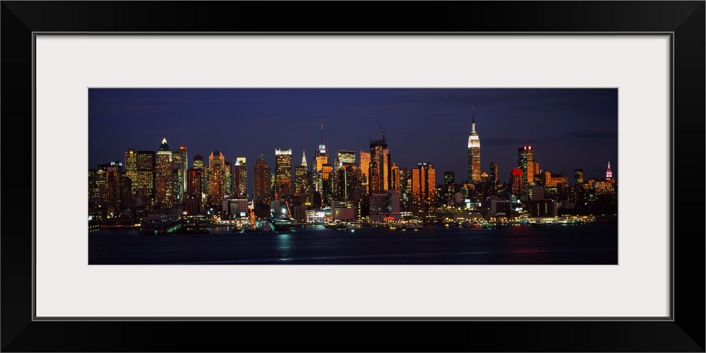 <p>Panoramic photograph of skyscrapers filling the skyline of Manhattan in New York at night. The bright lights of the buildings can be seen reflecting across the water.</p>