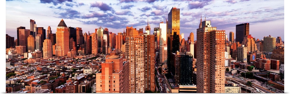 <p>Sunlight at dusk shining on the skyscrapers in New York City.</p>