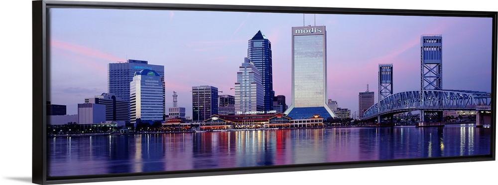 <p>A panorama view of the city skyline in Jacksonville during dusk. The buildings lights reflect in the water that sits in front of them.</p>