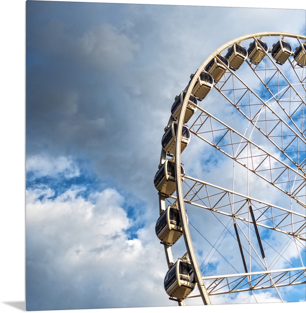 <p>The gondolas of SkyView Atlanta Ferris Wheel, a 20-story wheel, against a backdrop of clouds over Centennial Park, Atlanta, Georgia.</p>