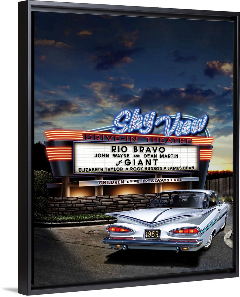 <p>Digital art painting of the Sky View drive-in theater playing Rio Bravo and Giant, with a classic white car filing into the show.</p>