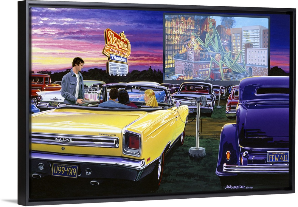 <p>Artwork of a drive in movie theater with classic cars parked in front of the screen and a sunset sky in the distance.</p>