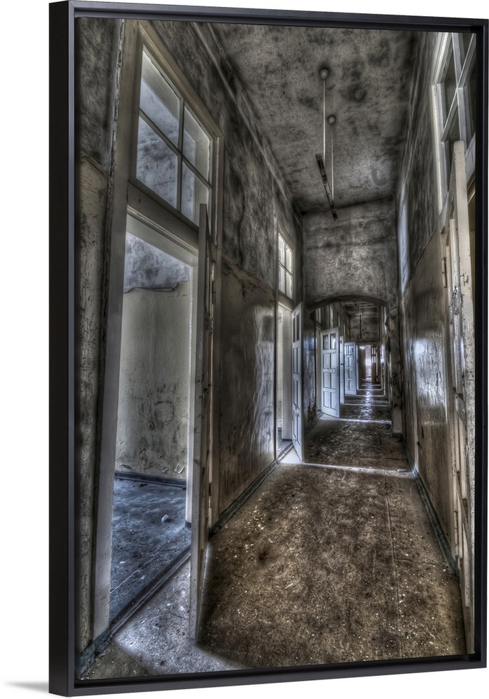 <p>Abandoned lunatic asylum north of Berlin, Germany. Empty corridor with open doors.</p>