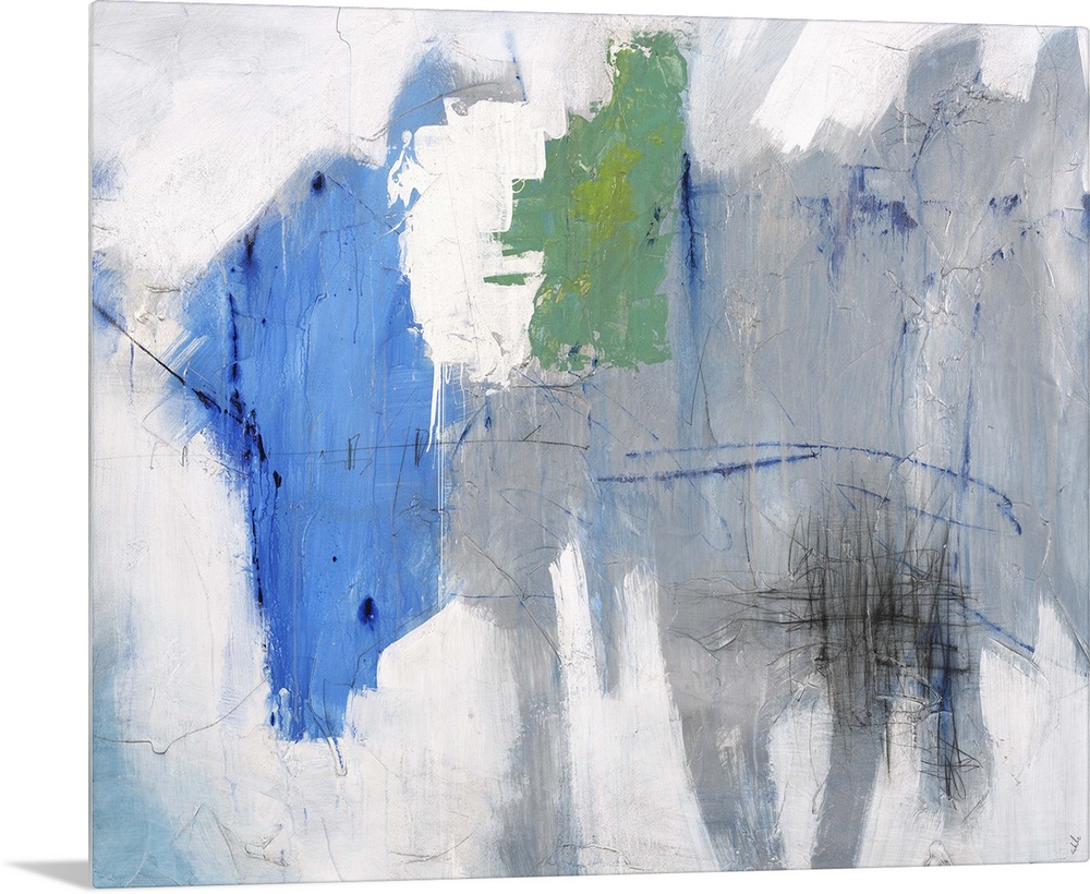 <p>Contemporary abstract painting of a gray toned background with pops of blue and green.</p>