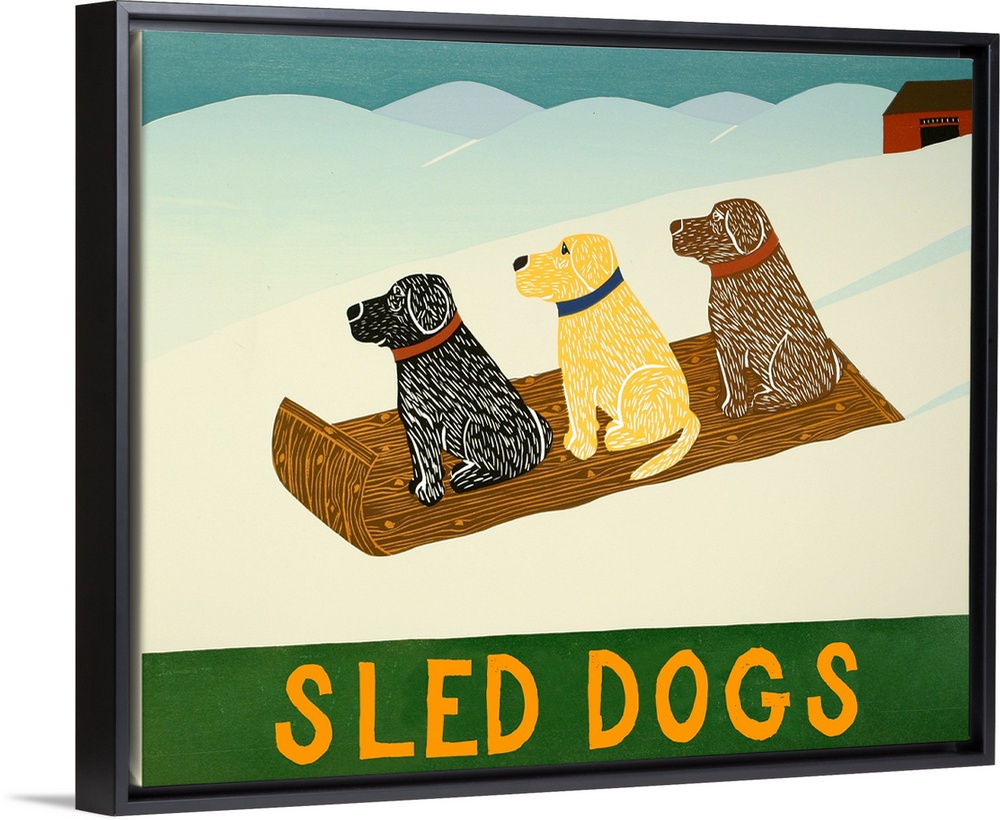 <p>Illustration of a chocolate, yellow, and black lab sledding down the slopes with the phrase "Sled Dogs" written on the bottom.</p>