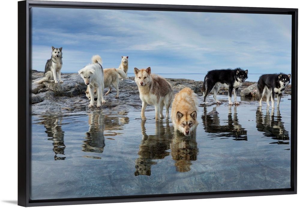 <p>Canada, Nunavut Territory, Repulse Bay, Sled dogs standing along shore on Harbour Islands beach</p>