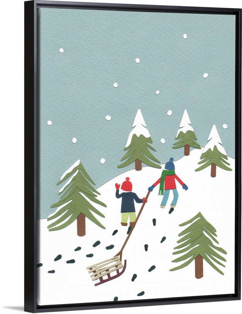 <p>Contemporary artwork of children climbing a hill with a sled</p>