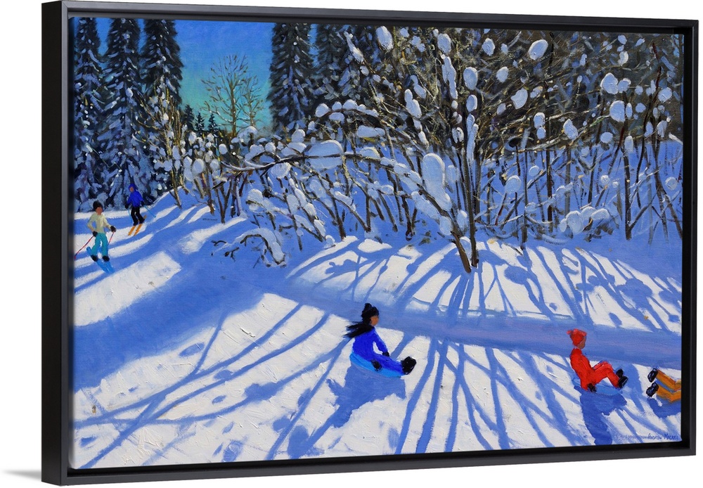 <p>Sledging and skiing down the trail, Morzine, oil on canvas. By Andrew Macara.</p>