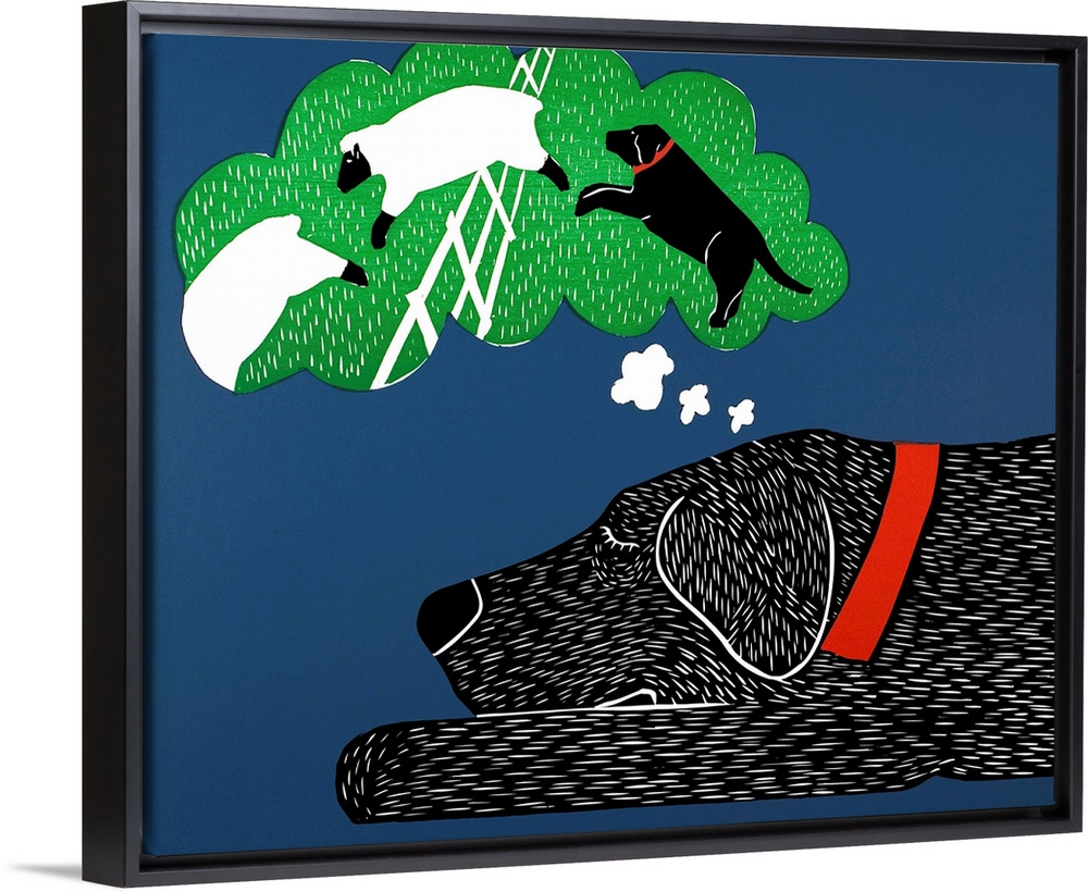 <p>Illustration of a black lab taking a nap and dreaming of herding sheep.</p>
