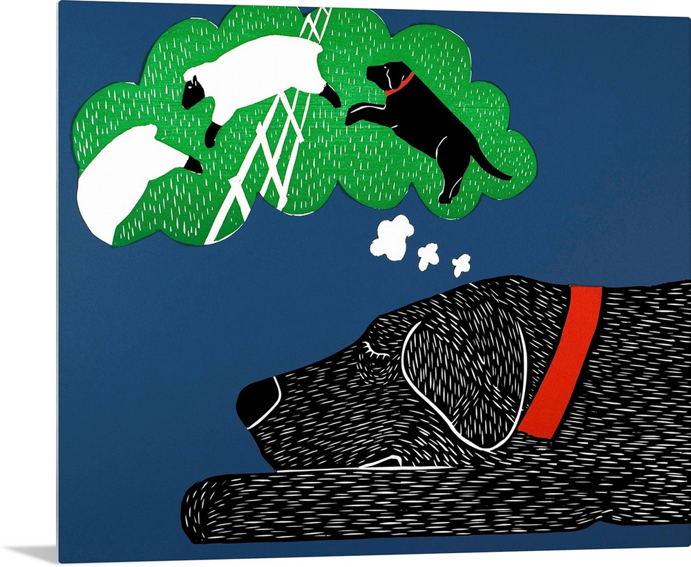 <p>Illustration of a black lab taking a nap and dreaming of herding sheep.</p>