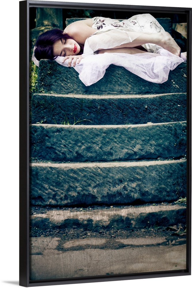 <p>Image of a sleeping young woman on the top of a set of stone steps in a peaceful garden setting</p>
