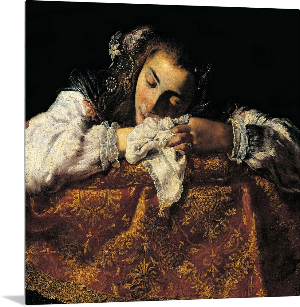 <p>Sleeping Girl, by Domenico Fetti, 16th Century - 17th Century, oil on canvas, cm 82 x 87,5 - Hungary, Budapest, Fine Arts Museum. Title sleeping girl handkerchief blouse white sofa brocade fabric. (155793) Everett Collection\Mondadori Portfolio</p>