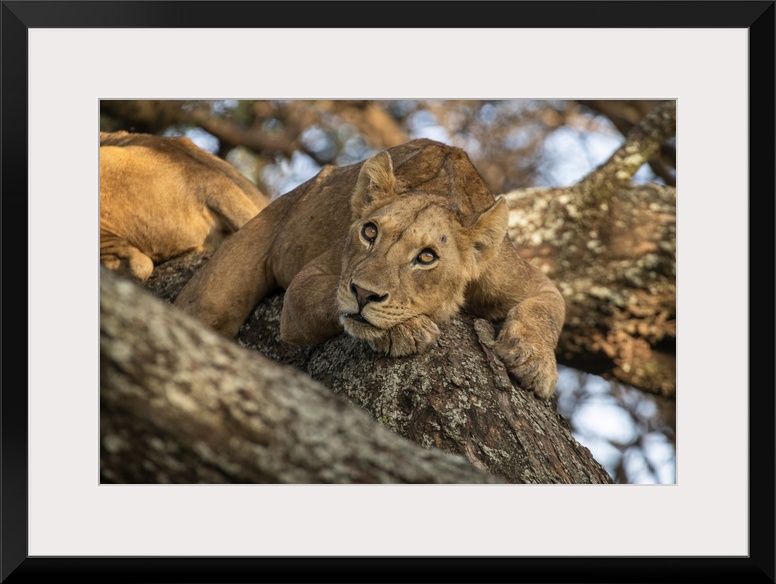 <p>Sleepy young male lions (Panthera Leo) resting in a tree in lake Manyara national park, Tanzania.</p>
