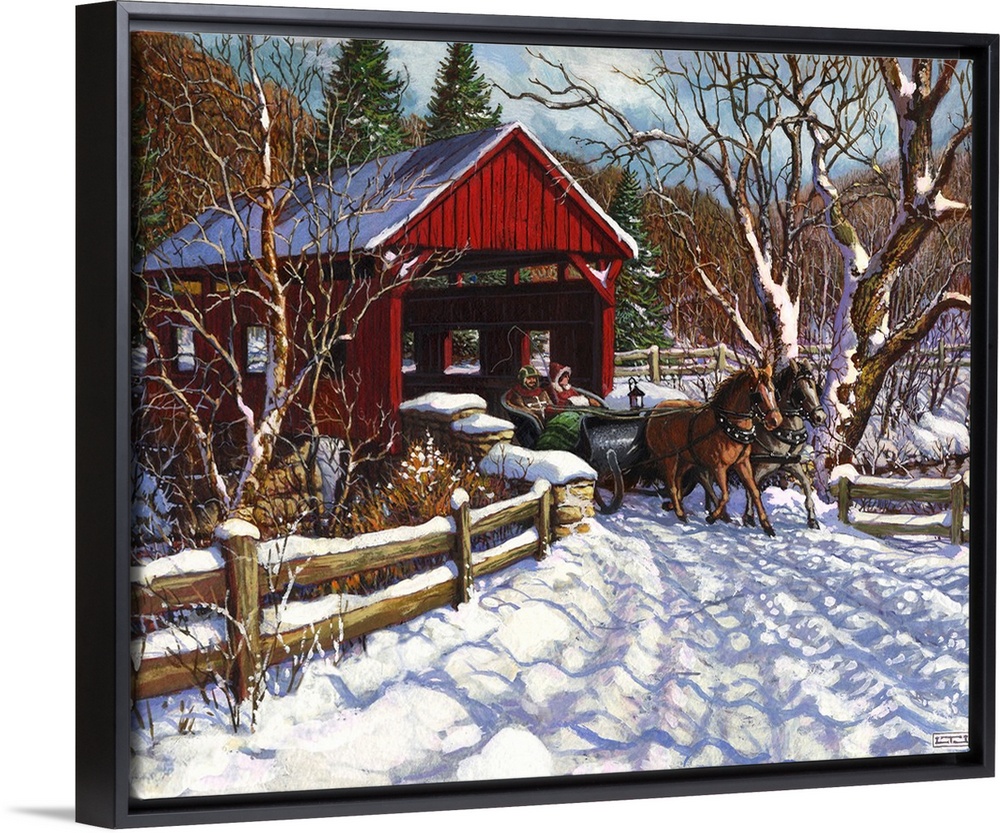 <p>A New England winter sleigh scene with covered bridge.</p>