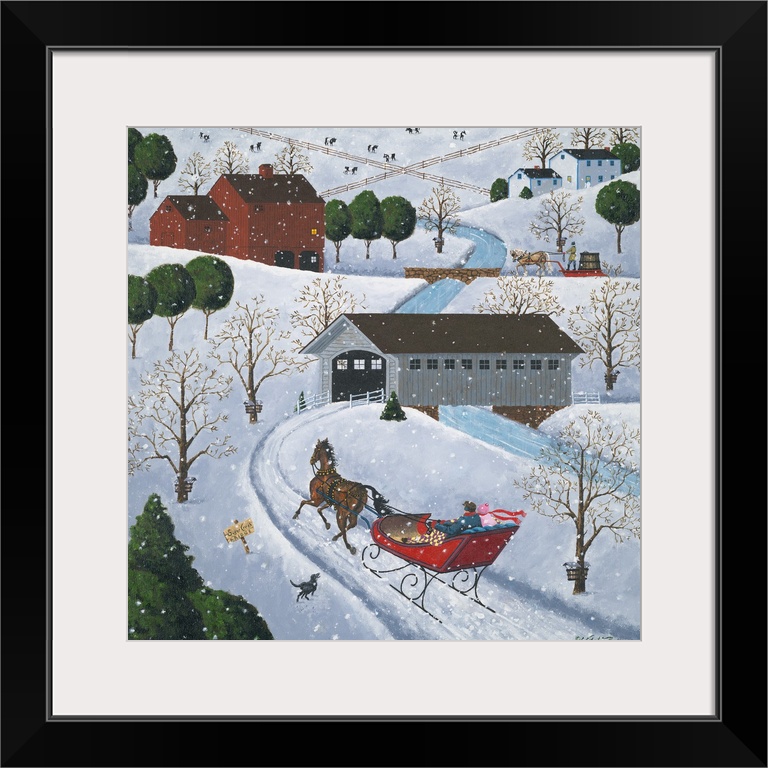 <p>Americana scene of a couple in a horse-drawn sleigh heading towards a covered bridge.</p>