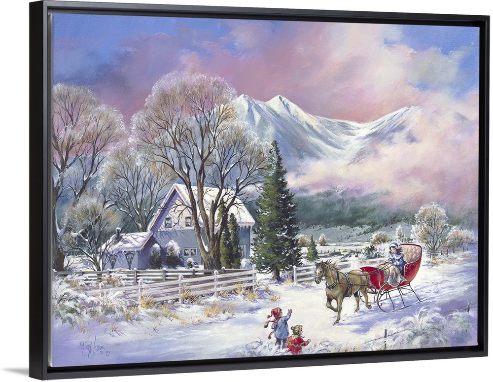 <p>Contemporary painting of two children waving to a horse drawn sleigh in winter.</p>
