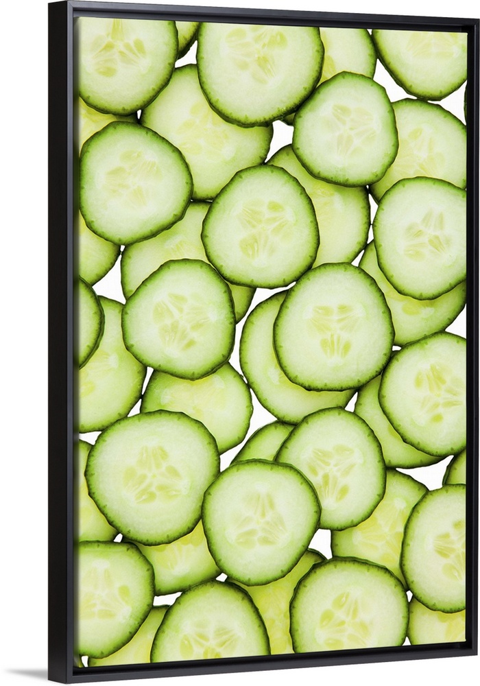 <p>Full frame of sliced cucumber, on white background, cut out</p>