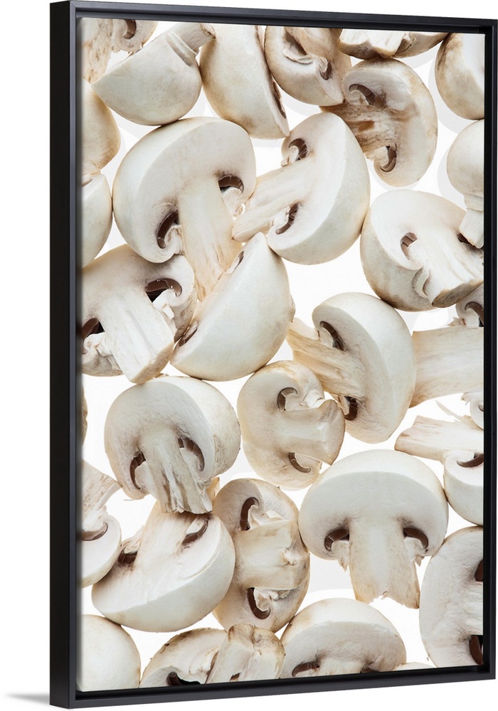 <p>Sliced button mushrooms (agaricus bisporus), on white background, cut out</p>