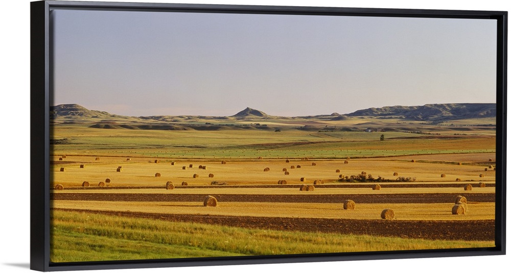 <p>Hay bills are scattered about and photographed in this vast open field.</p>