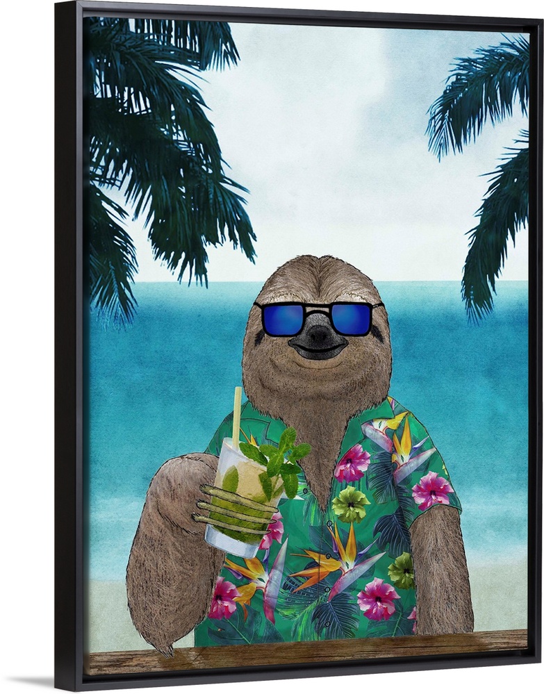 <p>A digital illustration of a sloth on vacation at the beach, enjoying a cocktail.</p>