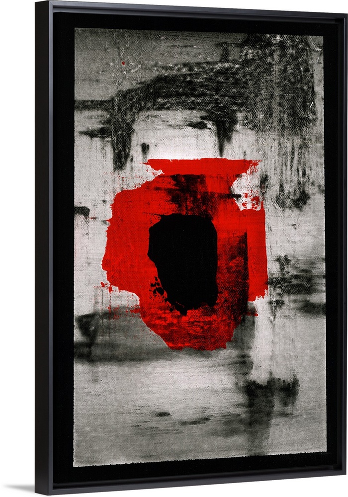 <p>Contemporary abstract painting made with dark black and gray hues, a bright red shape in the middle, and a solid black boarder.</p>