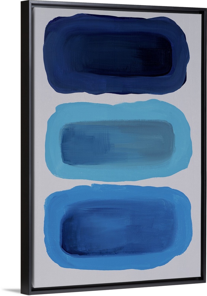 <p>Contemporary abstract painting with a gray background and three rounds shapes stacked vertically with different shades of blue.</p>