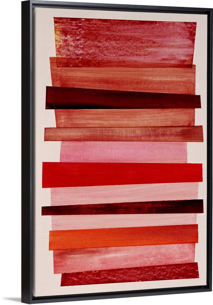 <p>Geometric abstract painting that has an off-white background and a mixture of red and pink differently sized rectangles stacked on top of each other in the center.</p>