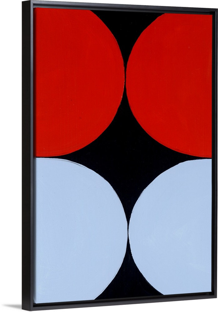 <p>Geometric abstract painting that has a solid black background and four large circles running off the sides, two red and two light blue.</p>