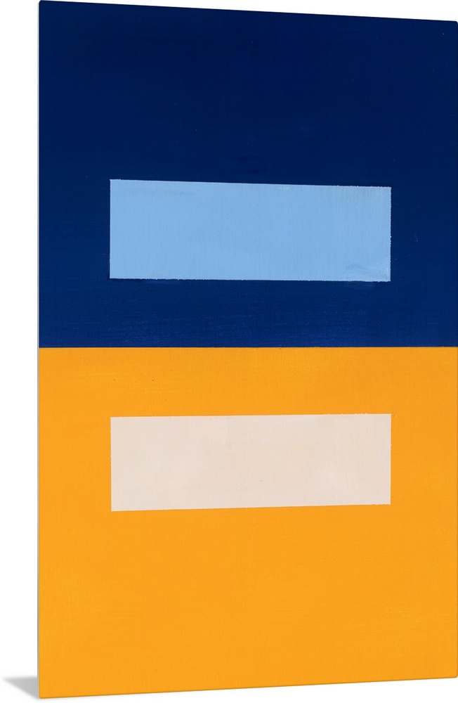 <p>Geometric abstract painting that has a background split into two square halves in gold and navy with a rectangle inside each.</p>
