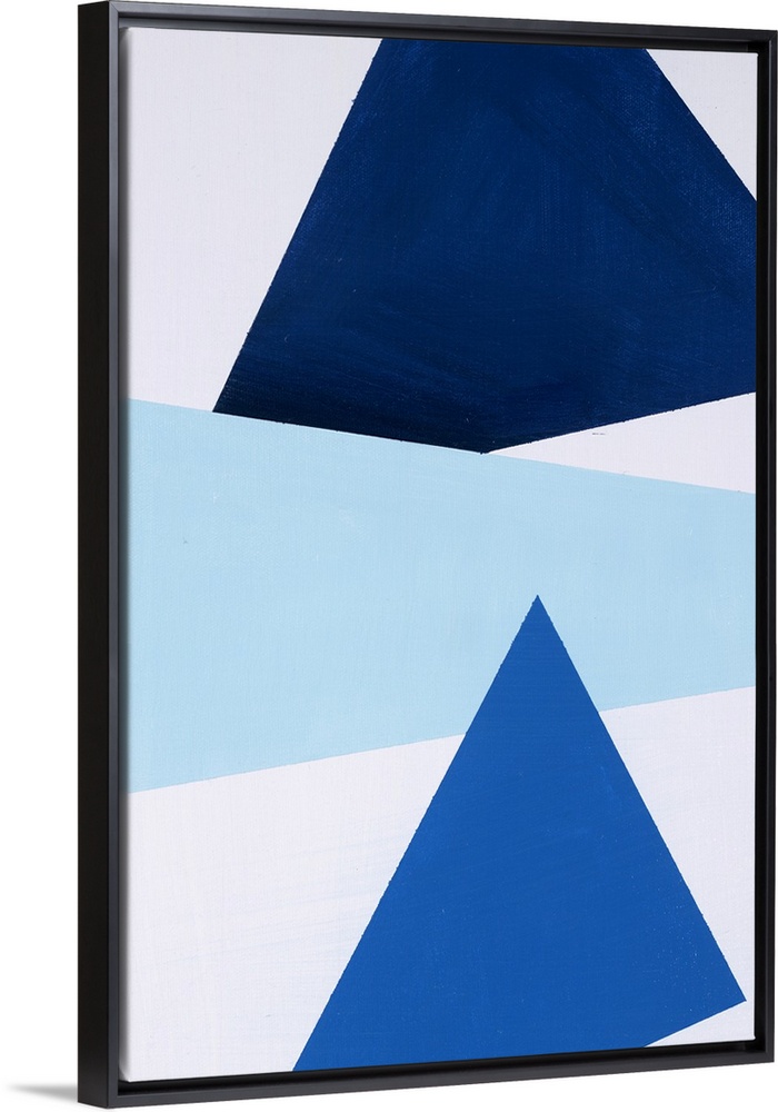 <p>Geometric abstract painting that has a white background with three large triangular shapes stacked on top of each other in different shades of blue.</p>