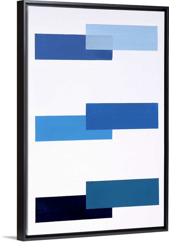 <p>Geometric abstract painting with a solid white background and various shades of blue rectangles placed in a pattern.</p>