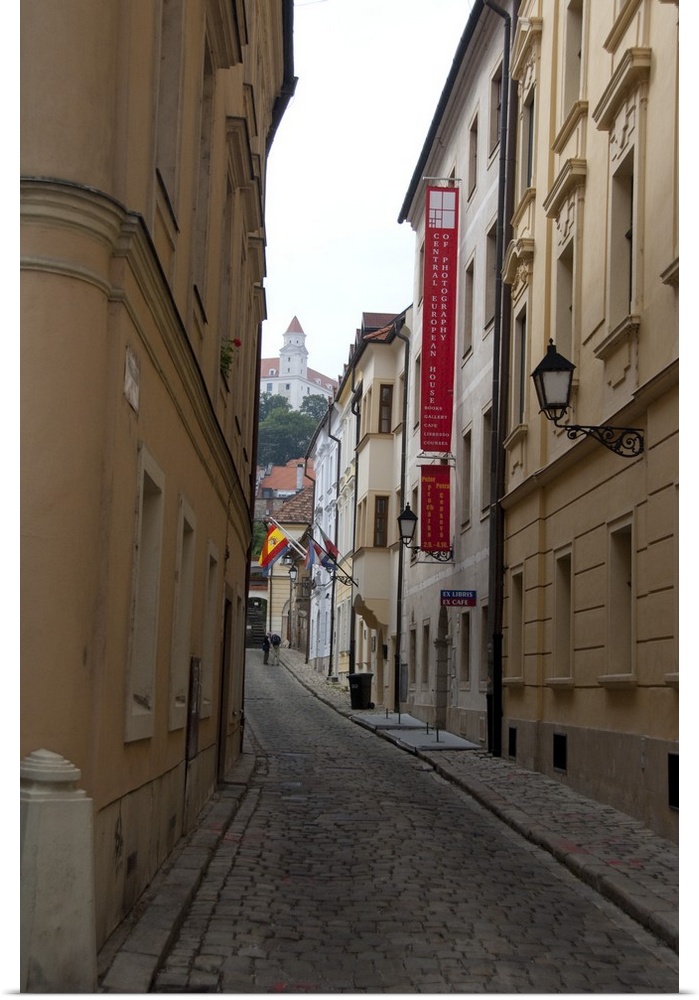 <p>Slovakia, Bratislava. Narrow street in historic district with view of Bratislava Castle in distance.</p>