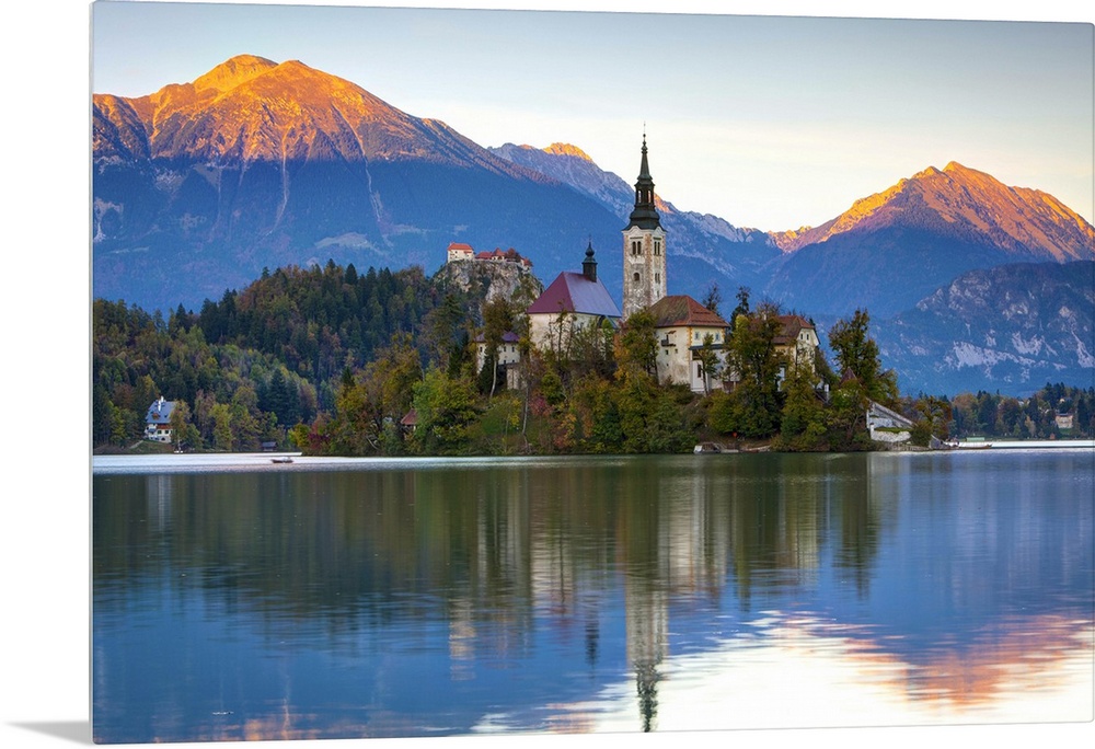 <p>Slovenia, Upper Carniola, Julian Alps, Triglav National Park, Bled, Bled Island with the Church of the Assumption and Bled Castle in the background at sunrise.</p>