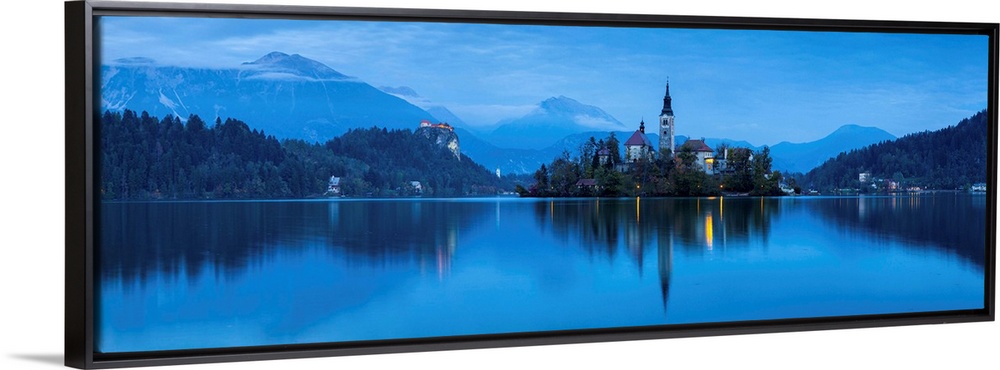 <p>Slovenia, Upper Carniola, Julian Alps, Triglav National Park, Bled, Bled Island with the Church of the Assumption and Bled Castle in the background at dusk.</p>