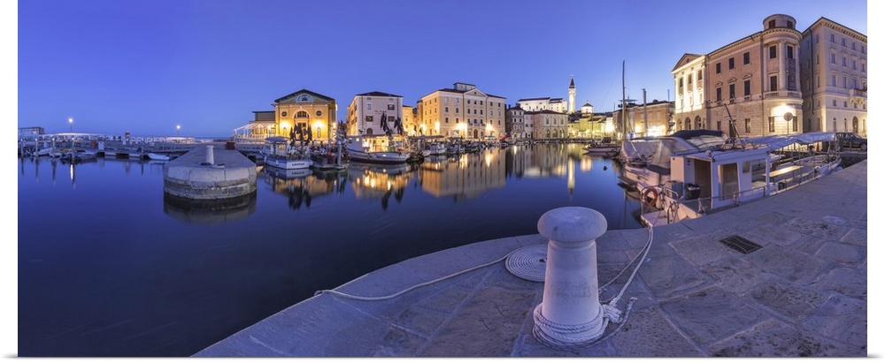 <p>Europe, Slovenia, Istria, Piran. The picturesque port and the buildings around it at dusk</p>